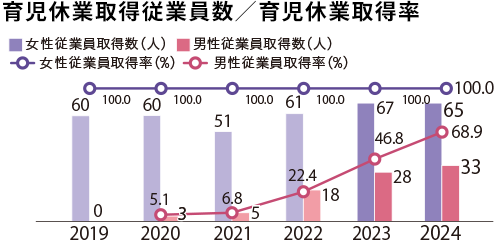 また、2022年10月に改正された育児・介護休業法と同時に、男性従業員の育児休業取得を促す新制度「出生時休業(産後パパ育休)」の運用を開始しました。2024年9月期の取得実績は33名(68.9%)でした。また、産後パパ育休を経験した従業員のインタビュー記事を社内に発信し、対象者の育休取得を促しています。 -