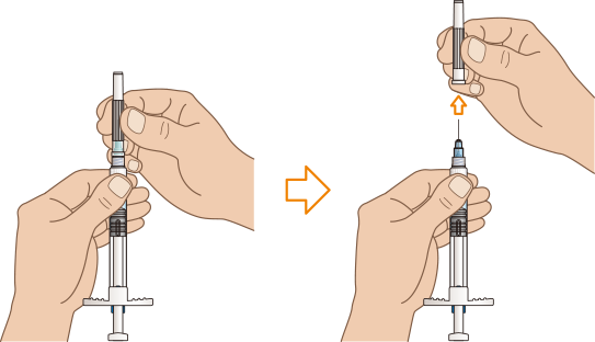 ②注射器を上に向けた状態で白い部分を持ち、注射針のキャップを外してください。