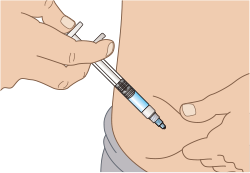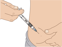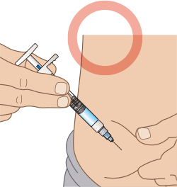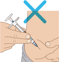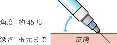 ②注射針を皮膚に対して斜めにして、つまんだ部分に刺してください。