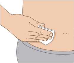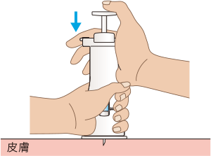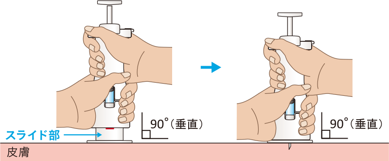 ③補助具を皮膚に押し付け、極力動かさないように固定します。固定できたら、スライド部が隠れるまで補助具を垂直に下げて注射針を刺します。