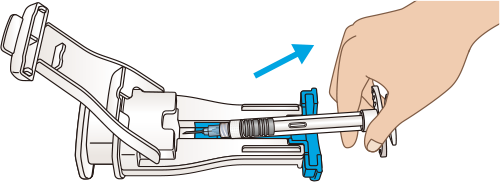 ②注射器を補助具に斜め上から差し込み、注射器をセットします。