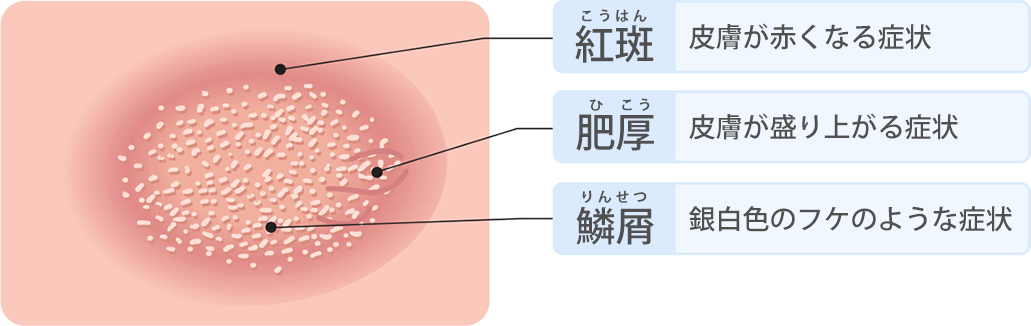 皮膚から少し盛り上がった赤い発疹の上に、銀白色のフケのようなものがくっついてポロポロとはがれ落ちるのが主な症状です。
