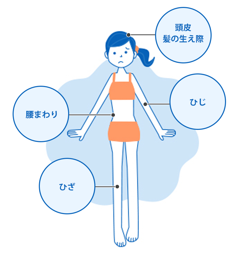 頭皮や髪の生え際、ひじ、ひざなど比較的外からの刺激を受けやすいところに出やすい傾向があります。