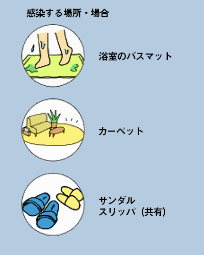 水虫(みずむし)は、水虫の人と直接足を触れ合うことがなくても、うつります。水虫の人が素足で履いたスリッパ、歩いた床や畳などに白癬菌(はくせんきん)がばらまかれているためです。