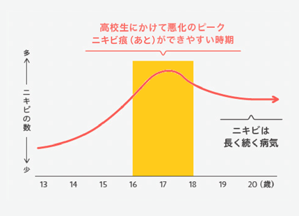ニキビは13歳頃からでき始め、高校生にかけて悪化のピークを迎えます。しかも、10代のうちにニキビ痕(あと)ができることもしばしば。ニキビ痕ができると病院での治療でも治すことが難しくなります。