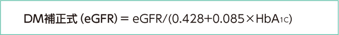 糖尿病患者では、高血糖により尿細管機能障害が引き起こされている可能性があり、血糖コントロールが不良な糖尿病患者では、Crの尿細管分泌が増加して腎機能が高く見積もられることがある4)。このような患者では下記のような補正式の使用も提案されている。また、2型糖尿病は他の腎疾患に比べても、罹患からの時間の経過とともに急激に腎機能が低下することがあるので注意が必要である5)。