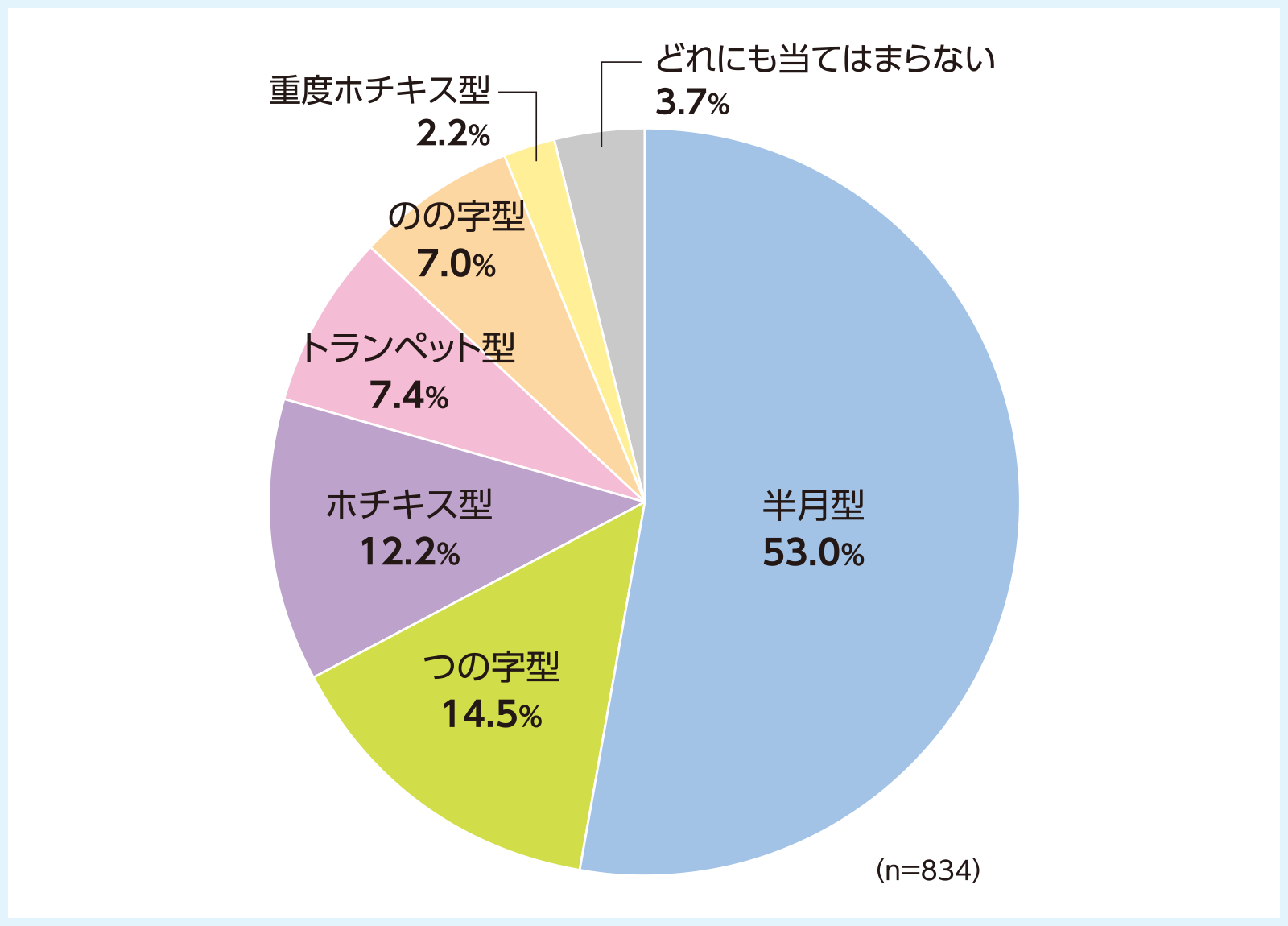 巻き爪の形は、「半月型」に次いで、「つの字型」、「ホチキス型」が多いことがわかりました。