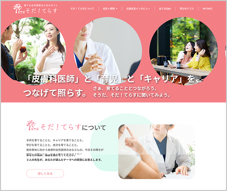 「そだ!てらす」は、産休・育休の取得や復帰、その後のキャリア形成などの悩みを抱えている医師のための情報サイトです。