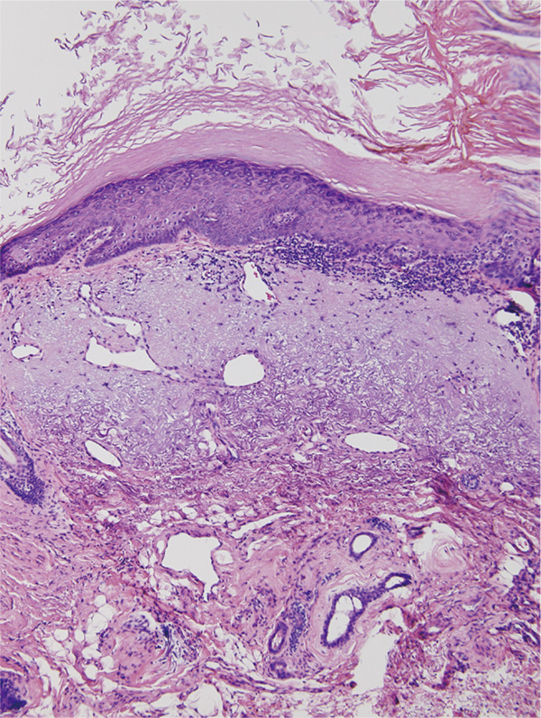 これは、紫外線障害に対する代償的産生と考えられており、結果として不規則な塊状沈着としてエラスチカ・ファンギーソン染色で観察できる。ここには、エラスチン以外にもフィブリリン、バーシカンや接着分子であるフィブロネクチンが含まれる。この現象は高齢者の露光部から採取した病理標本で、真皮乳頭層から網状層にかけて淡く好塩基性に染まる線維塊として容易に観察できる(図3)。紫外線が惹起する変化であり、日光角化症などの病理標本で高率にみられる。