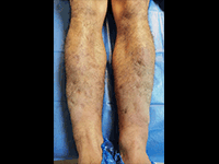 30代、男性。18ヵ月前から脛骨前面に硬結を伴う局面とびまん性の非陥凹性浮腫が認められるため受診した。局面は疼痛やそう痒を伴わず、一部は紫褐色を呈していた。患者は前医で…