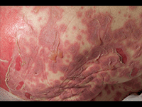 80代、女性。パーキンソン病に罹患しており、4日前から発熱、倦怠感、眼のゴロゴロ感、咽頭痛があり、拡大する皮疹が全身に認められたため救急外来を受診した。皮膚疾患の既往歴はなかった。…