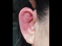 女性、40代。1ヵ月前から両耳介の腫脹と圧痛があり、手掌と手指の疼痛と軽度の胸部絞扼感が生じていたため受診した。慢性感染症の既往歴や職業曝露歴はなかった。診察では両耳介に、…