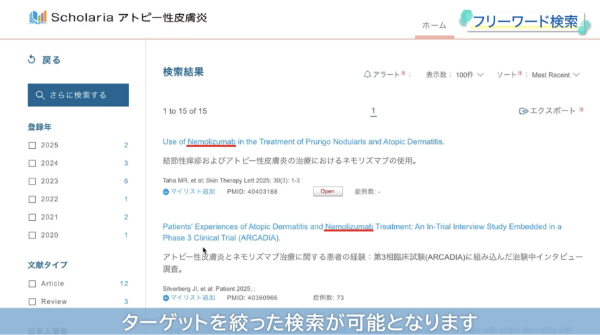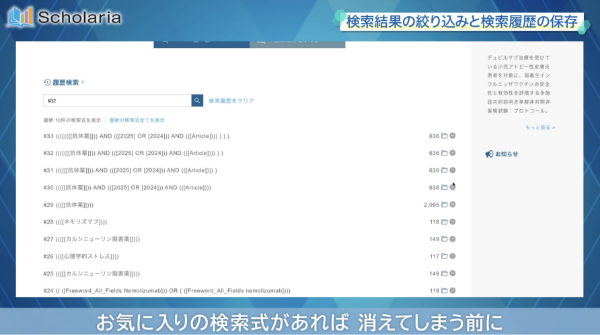 Scholariaの特徴である検索の仕組みや絞り込み、検索式の再利用する方法などを動画でご紹介しています。