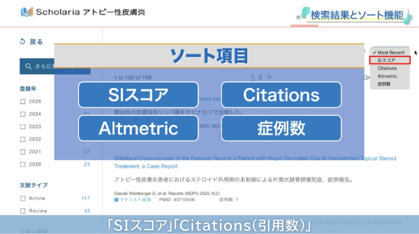 - 症例数、引用数、オルトメトリクス、ユーザー評価などの指標で文献の評価を瞬時に把握することができ、その指標で文献をソートできます
