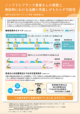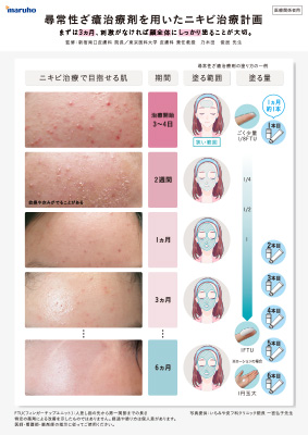ニキビの病態、薬の働き、治療経過、副作用と対処法、塗り方(ステップアップ方法や患者さんの現在の塗り方・効果の確認)、今後の治療計画を説明できる内容です。(A4サイズ)