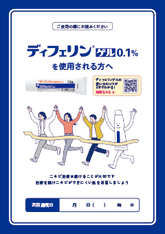 ディフェリンゲル0.1%を処方された患者様向けに、治療継続の重要性、病態、薬の働き、副作用と対処法、使用方法、使用上の注意、洗顔ポイントを説明できる内容です。表紙に、約3分でお薬の使い方を解説したアニメーション動画の二次元コードを掲載しています。(A5サイズ)